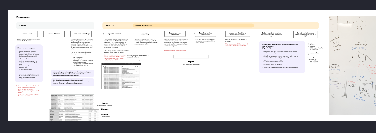 At this early stage in development, there were some parts of the product that were manual, and some that were powered by AI processes and automation.The manual parts were the creation of an ontology, which powered the categorisation of the analysis.