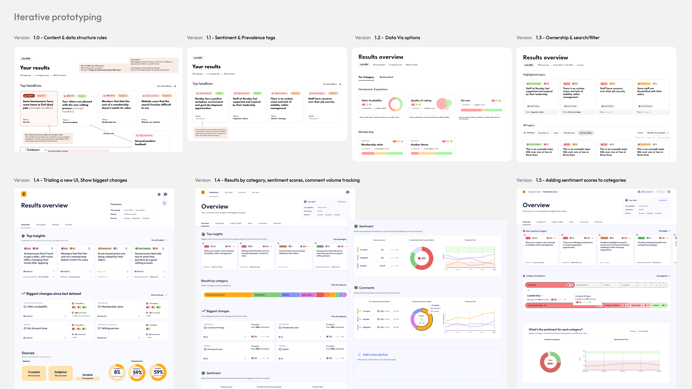 You can also see that I spent some time refining a UI style. The feedback was overwhelmingly in favour of a light-mode, friendly and approachable direction, using colour sparingly to denote things like status or sentiment, so that was the direction I took.