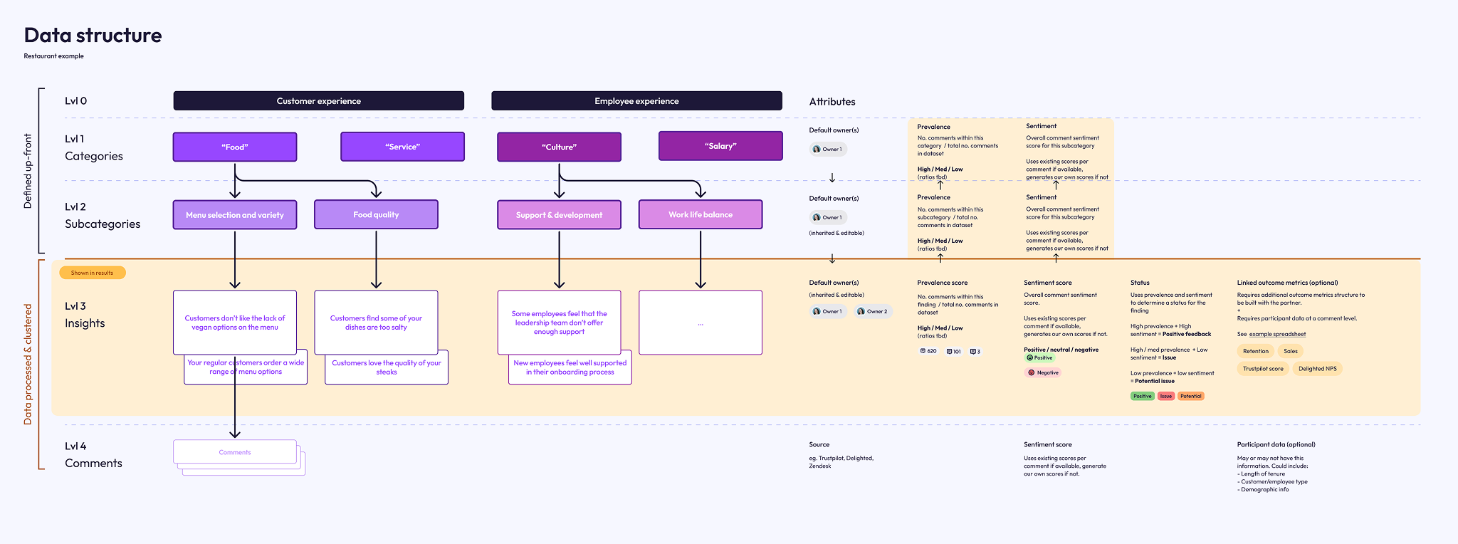 The way it would work was: an individual comment (or part of a comment), would be assigned a sentiment score, if one wasn't already provided as part of the data. If that comment was categorised, then all the comments within that category would have their sentiment scores summed up and averaged into an overall sentiment score for that category. I worked with our founder, a PhD Statistician, to ensure the method yielded statistically accurate results.