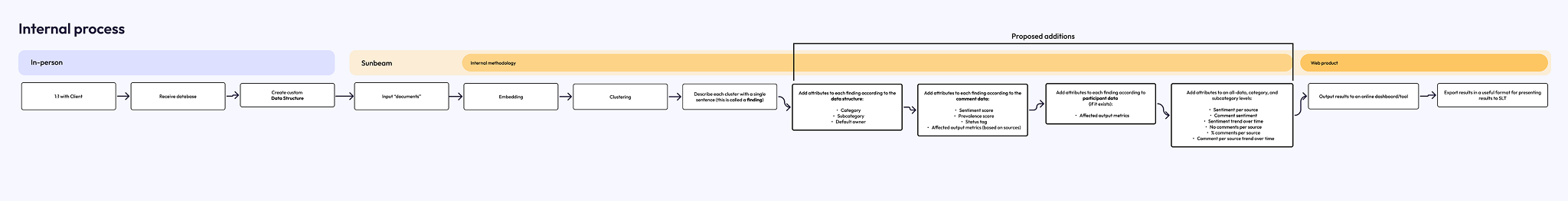 I needed to understand the product in its existing state, how it worked behind the scenes, and what made it unique. I conducted team workshops and discussions in order to map the full process in laymans terms and document a shared understanding.