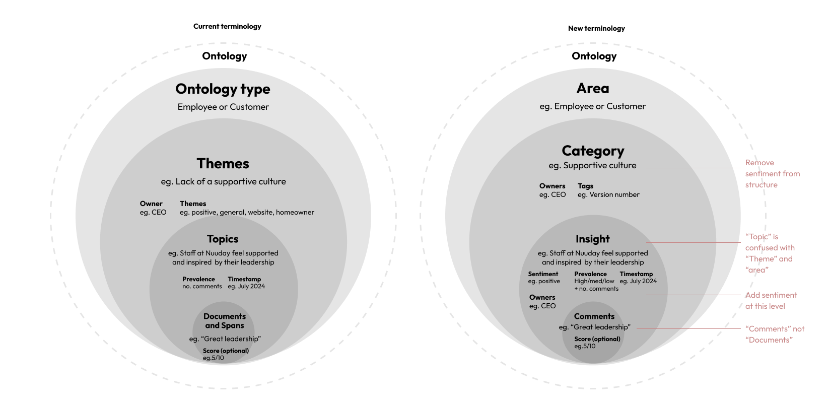 The way everything was named and labelled in the UI was, naturally, developer-coded. The quotes from employee surveys were called "documents" which was often confused for the documents being uploaded. Parts of those quotes were called "spans". The categories of findings made by the ontology (taxonomy) were called "themes" while the clusters of findings were called "topics". Themes and topics were also constantly swapped and confused.